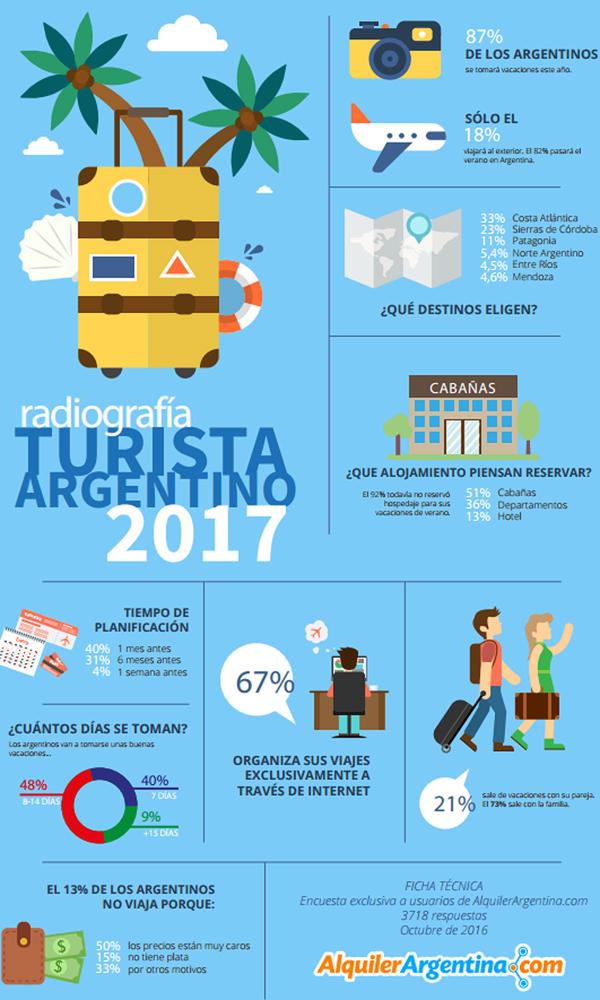 La encuesta, realizada por el sitio AlquilerArgentina.com entre 3.718 consultados, reveló que el 87% de los argentinos afirmó que se va de vacaciones en 2017, mientras que el 13% de los consultados por el sitio especializado sostuvo que este año no se podrá tomar vacaciones. De este último segmento, el 50% dijo que es porque los precios están muy altos, el 15% “no tiene plata” y el 33% por otros motivos.