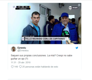 Memes, cargadas y tuits muy originales opinaron sobre el desenlace del partido, que fue postergado por el árbitro Facundo Tello pese a decir que el campo estaba en “perfectas condiciones”. El gesto de Juan Carlos Crespi, acompañante del plantel xeneize, guiñando el ojo tras la reunión con el juez fue el recurso recurrente de los usuarios. Aquí, un repaso por los mejores tuits.