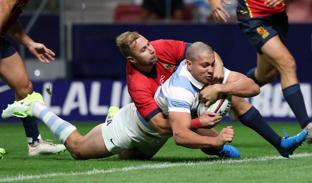 Buen partido de Isgró. (AFP)Durante el primer tiempo, Los Pumas hicieron destrucción total ante una defensa española que llegaba tarde a los tackles y no podía parar la ofensiva nacional. Tanto es así que los forwards se encargaban de ganar metros con sus avances y, luego, los backs aprovechaban los espacios para ir a fondo con su velocidad. De esa manera, aparecieron los tries de Mateo Carreras y Mallía (dos de los que estarán desde el arranque en el debut mundialista del 9/9 vs. Inglaterra). Además, Rodrigo Isgró también demostró que la transición del Seven al XV no le costó y que cada vez que tiene la oportunidad va para adelante como si no hubiera un mañana. En el inicio del segundo tiempo, lo bajaron cuando estaba a punto apoyar en el ingoal contrario.