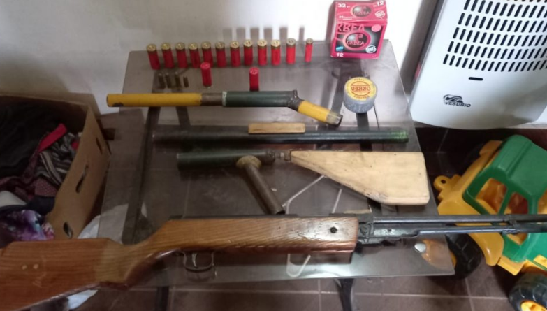 Se secuestraron una tumbera, un rifle aire comprimido, caja de balines de plomo, cartuchos calibre 38 largo, cartucho calibre 9 mm y una caja de cartuchos conteniendo 12 cartuchos marca orbea calibre 12. Faltan aún los dos revólveres y los cargadores con el que amenaza con matar “Pequeño”.