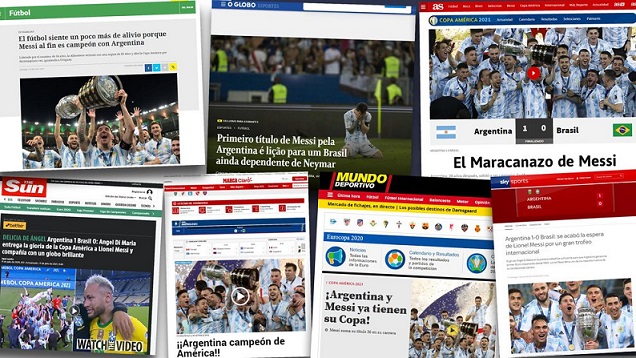 En Inglaterra, el periódico The Sun detalló que “Ángel Di María le entrega la gloria de la Copa América a Lionel Messi y compañía con una definición brillante”, mientras que SkySports tituló: “Se acabó la espera de Lionel Messi por un gran trofeo internacional”.