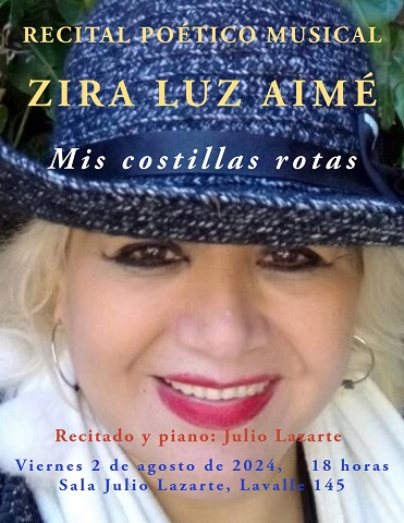 - Viernes 2 de agosto, “Mis costillas rotas”, de Zira Luz Aimé. Recitado y piano, Julio Lazarte.