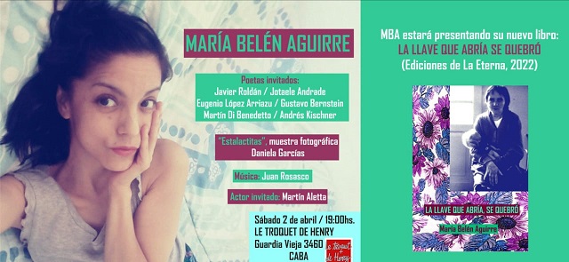 Ir a una presentación de María Belén Aguirre es ser espectador de un verdadero show. La acompañarán los poetas: Javier Roldán, Jotaele Andrade, Eugenio López Arriazu, Gustavo Bernstein, Martín Di Benedetto y Andrés Kischner.