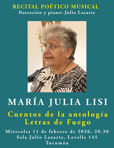 Letras de Fuego / Noticias. En la continuidad de las presentaciones de los autores que integran la Antología Letras de Fuego, este miércoles 11 de febrero será el turno de la escritora María Julia Lisi, con la narración y el piano del Maestro Julio Lazarte.