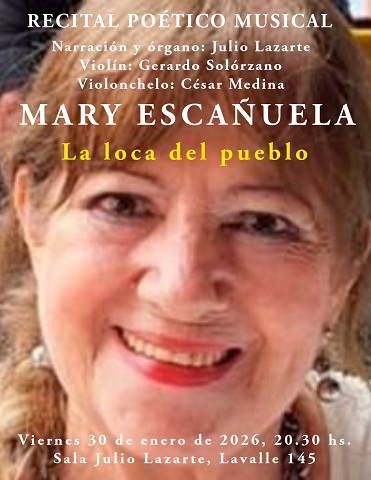 Letras de Fuego / Noticias. Hoy, viernes 30 de enero, la voz del Maestro Julio Lazarte le dará movimiento vivo al libro “La loca del pueblo”, de la escritora santiagueña Mary Escañuela. Una autora prolífica de La Banda, en la vecina provincia.