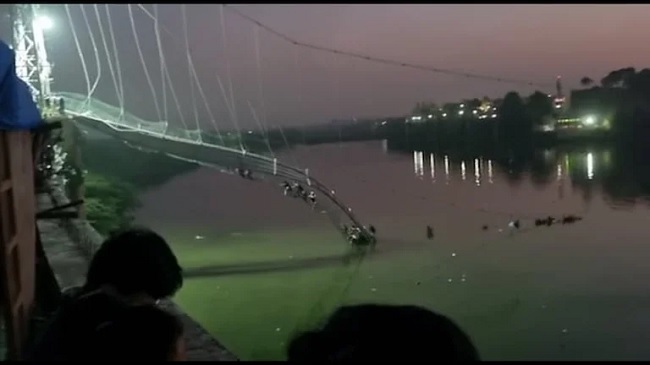 El puente se vino abajo la tarde de este domingo, dejando caer al río a un número todavía incierto de personas que no lograron abandonar la estructura cuando comenzó a ceder. Según el canal de televisión local Zee News, más de 400 personas estaban en el puente, una cantidad que la estructura no podría soportar.