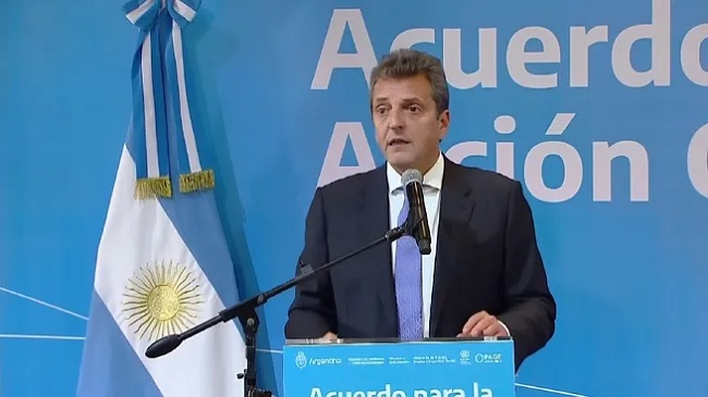 En el cierre del Encuentro sobre Economía Verde y Acción Climática realizada en el CCK, Sergio Massa anunció un Acuerdo para la Acción Climática que vincula medidas entre el Ministerio de Economía, Ministerio de Trabajo y el Ministerio de Medio Ambiente, en busca de promover el desarrollo productivo contemplando el cambio climático.
