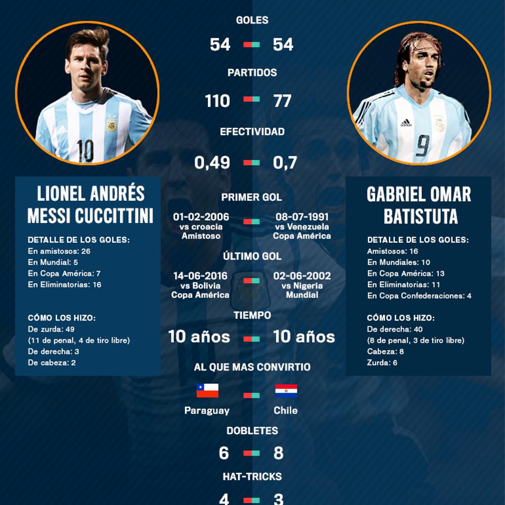 Messi alcanzó el récord que Batistuta había establecido en 2002 con su gol a Nigeria en el debut de la Argentina en el Mundial de Corea-Japón. Aquel recordado tanto de cabeza fue su último con el equipo nacional y debieron pasar 14 años para que alguien desempolvara la cifra. Lo hizo Leo, ¿quien otro si no?