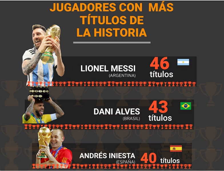 Lionel Messi es el futbolista argentino con más títulos en la historia, donde mantiene un amplio margen respecto de sus máximos perseguidores. Ángel Di María, se colocó como su único escolta con 35. En tanto que Carlos Tevez (29), ya retirado, completa el podio.