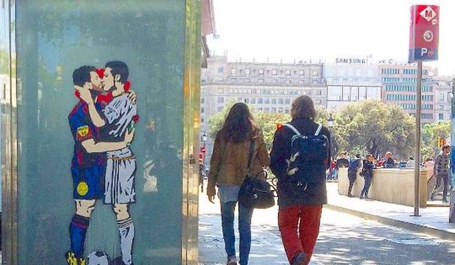 El Paseo de Gracia, mítico lugar de Barcelona, amaneció con un mural donde se puede ver a Lionel Messi y Cristiano Ronaldo a los besos. ¿Quién lo hizo? El artista Tvboy desplegó esta obra llamada “El amor es ciego” con el fin de pedir más amor para el cruce que se viene.