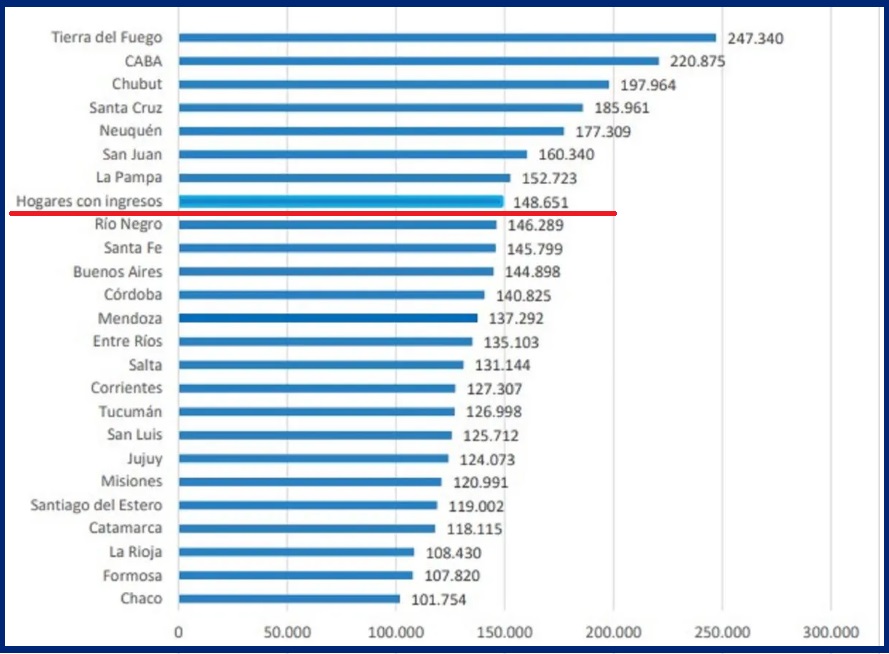 El ingreso medio total familiar de Tierra del Fuego y CABA es de $247.340 y $220.875, respectivamente, mientras que el de Chaco y Formosa es de $101.754 y $107.820.