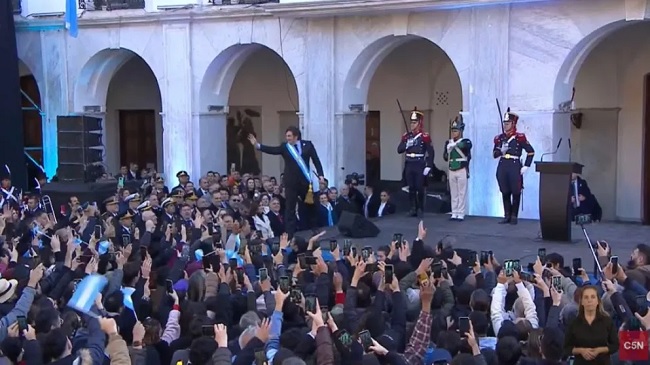 Euforia. El presidente Milei saluda a la gente que fue escucharlo al CabildoCuándo se anunció el Pacto de Mayo