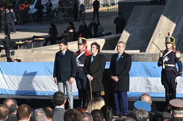 Javier Milei junto al gobernador Maximiliano Pullaro y al intendente de Rosario, Pablo Javkin. Foto: Leo GalettoMilei también dijo que cuando Belgrano escribió el Triunvirato para que adoptaran la bandera como símbolo oficial, “el Gobierno de Buenos Aire la rechazó y le ordenó que izara otra bandera. Porque la dirigencia política en Buenos Aires aún no hablaba de independencia, de un país libre, sino de un Gobierno autónomo de las autoridades virreinales, pero fiel a la corona y a Fernando VII. No querían mandar un mensaje diplomático equivocado, querían cuidar las formas, como aún les gusta hacer a algunos hoy, algunos guiados por el miedo, porque no se animaban a ser libres, otros porque directamente querían seguir siendo súbditos”.
