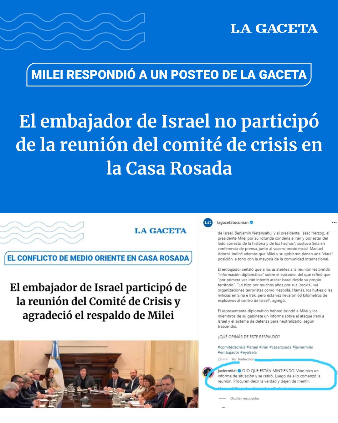 El Presidente Javier Milei acusó este lunes de “mentiroso” al diario La Gaceta a través de las redes sociales, luego de que el centenario diario informara que el embajador de Israel, Eyal Sela, participó de la reunión de Gabinete realizada durante la noche del domingo en Casa Rosada, en el marco de la escalada bélica en Medio Oriente