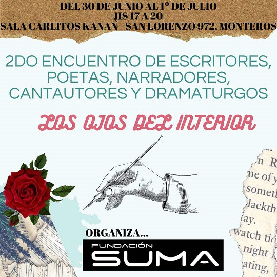 Letras de Fuego / Noticias / Literatura a pleno. La Fundación SUMA, presidida por Mirta Cuarterón, concretará este viernes 30 de junio y el sábado 1º de julio, el 2º Encuentro de Escritores “Los ojos del interior”, que desarrollará diversas y enriquecedoras actividades culturales.