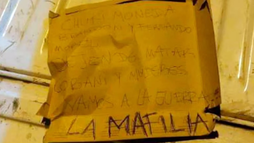 En el primer relevamiento hecho por las fuerzas de seguridad se pudo constatar la existencia de cámaras, que aparentemente captaron la balacera. También registró el momento en el que el sicario dejó un cartón con un mensaje escrito en birome. El texto está dirigido a Alejandro Núñez, alias “Chucky Monedita”, y Fernando “Enano” Morel, ambos presos por asociación ilícita y balaceras, y relacionados con la banda narco Los Monos.