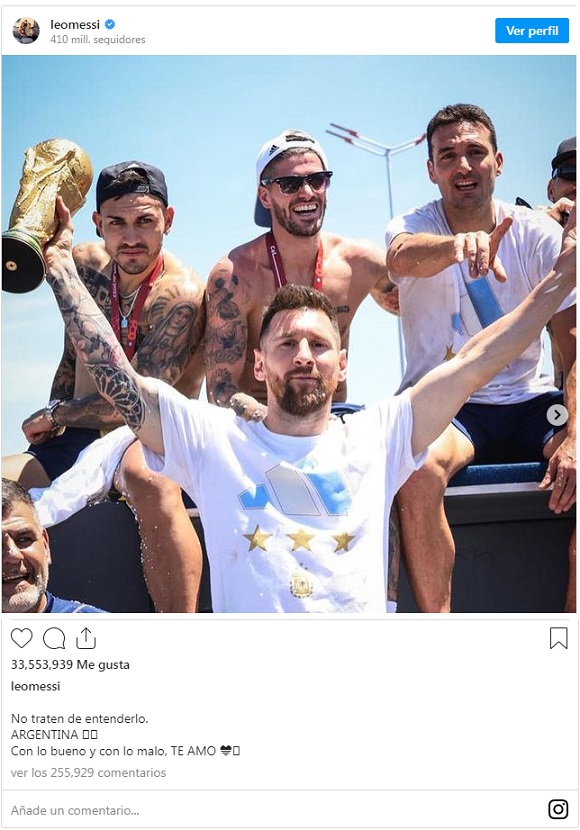 Un día después de la locura, Lionel Messi, se dirigió a sus seguidores a través de las redes sociales y publicó un emotivo mensaje en su cuenta de Instagram, donde tiene más 400 millones de seguidores: “No traten de entenderlo. ARGENTINA. Con lo bueno y con lo malo. TE AMO”.