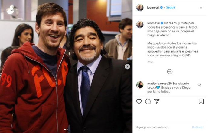 “Un día muy triste para todos los argentinos y para el fútbol. Nos deja pero no se va, porque el Diego es eterno”, escribió la Pulga en su cuenta de Instagram, dejando en claro que el recuerdo del astro del Napoli y campeón del mundo en México 86 no se extinguirá jamás. “Me quedo con todos los momentos lindos vividos con él y quería aprovechar para enviarle el pésame a toda su familia y amigos. QEPD”, añadió.