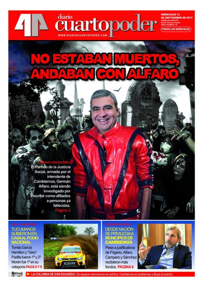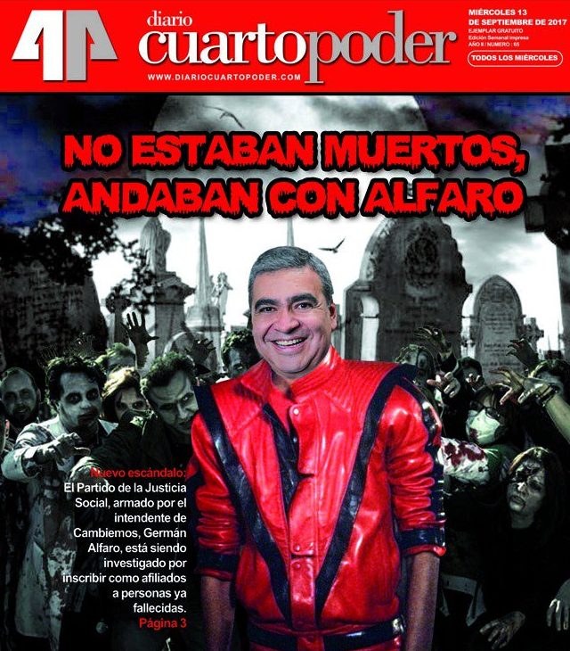 Como si se tratara del propio Michael Jackson, en el primer video clip de la historia de la música, el intendente capitalino Germán Alfaro, parece seguido por un grupo de zombies y muertos vivos. En esta ocasión, los representantes de su estructura política, el Partido de la Justicia Social (PJS), tendrán que dar explicaciones ante el fiscal federal, Carlos Brito, por la inclusión de catorce personas muertas entre los afiliados del nuevo partido.