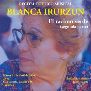 • “El racimo verde” (Segunda parte), de Blanca Irurzun. A las 20, en Sala Lazarte, Lavalle 145, San Miguel de Tucumán. Narración y piano: Maestro Julio Lazarte.