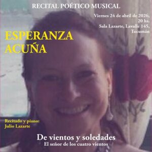 • “De vientos y soledades” El señor de los cuatro vientos, de Esperanza Acuña. A las 20, en Sala Lazarte, Lavalle 145, San Miguel de Tucumán. Recitado y piano: Maestro Julio Lazarte.