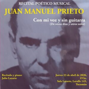 • “Con mi voz y sin guitarra” (De otros días y otros soles), de Juan Manuel Prieto. A las 19, en Sala Lazarte, Lavalle 145, San Miguel de Tucumán. Recitado y piano: Maestro Julio Lazarte.