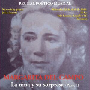• “La niña y sus sorpresa” (Primera parte), de Margarita del Campo. A las 19, en Sala Lazarte, Lavalle 145, San Miguel de Tucumán. Narración y piano: Maestro Julio Lazarte.