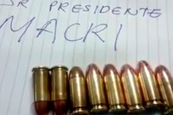 Las imágenes son impactantes. Ocho municiones y una pistola acompañan un escalofriante mensaje para el presidente Mauricio Macri.