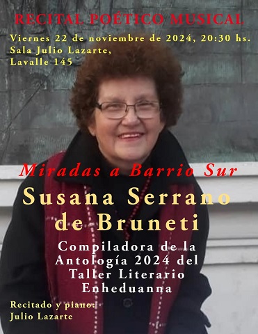 Viernes 22 de noviembre: a las 20.30, “Miradas a barrio Sur”, Susana Serrano de Bruneti, compiladora de la Antología 2024 del Taller Literario Enheduanna”. Recitado y piano: Julio Lazarte.