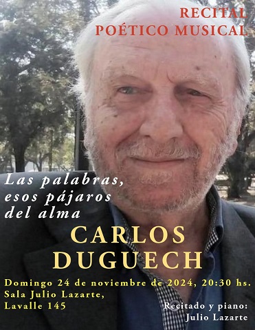 Domingo 24 de noviembre: a las 20.30, “Las palabras, esos pájaros del alma”, de Carlos Duguech. Recitado y piano: Julio Lazarte.