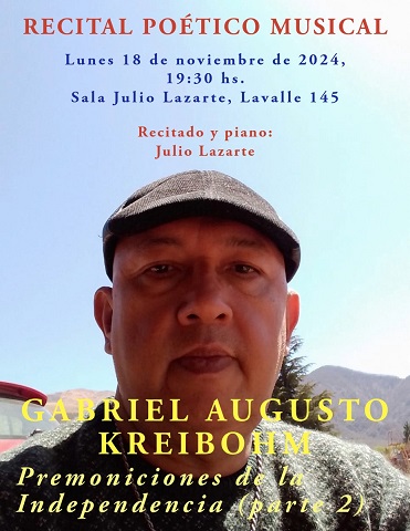 Lunes 18 de noviembre: a las 19.30, “Premoniciones de la Independencia” (Parte 2), de Gabriel Augusto Kreibohm. Recitado y piano: Julio Lazarte.