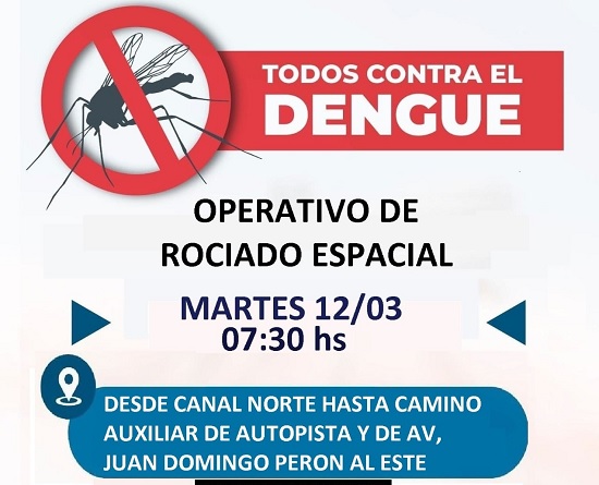 El operativo comenzará mañana Martes 12/03 a las 07:30 Hs. con el rociado espacial desde canal norte hasta camino auxiliar de autopista y de Av. Juan Domingo Perón al Este.