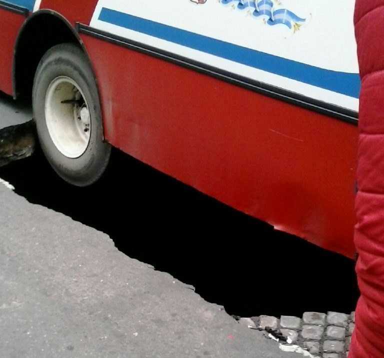 Los pasajeros se sorprendieron por el tremendo ruido que hizo el pavimento al ceder bajo el peso del colectivo y por la detención de la marcha. Recién supieron lo que había pasado cuando descendieron y vieron que se había abierto un cráter de unos cinco metros. En las primeras hipótesis se señaló que el lugar no había sido consolidado adecuadamente después de una obra de la Sociedad Aguas del Tucumán (SAT). Cabe recordar que el municipio capitalino viene reclamando los perjuicios en materia de baches y mal estado del pavimento, a causa de las innumerables obras mal realizadas por la empresa estatal que tiene a su cargo el servicio de agua y cloacas.