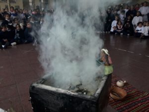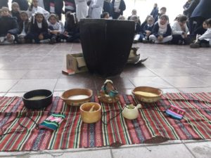 Se dispusieron las ofrendas y se colocó, en el centro del patio, un macetón en el que el se encendió el fuego para que las alumnas y docentes dejaran las ofrendas.