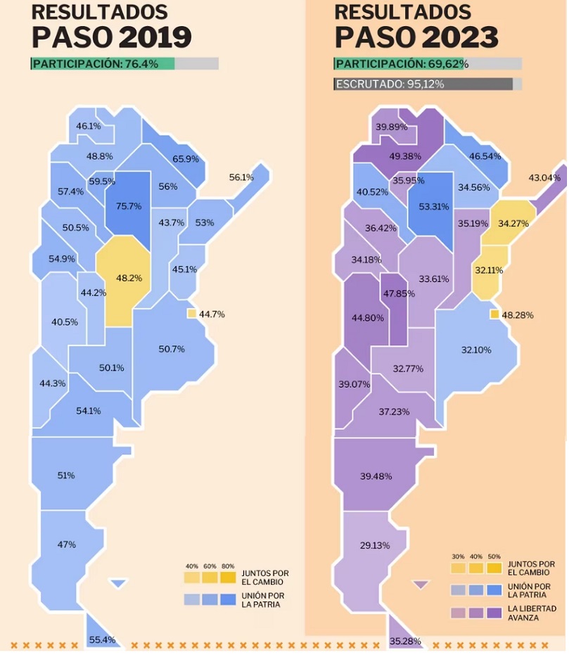 El kirchnerismo es uno de los grandes derrotados de estas PASO. Sergio Massa fue el segundo candidato más votado, pero Unión por la Patria quedó como la tercera fuerza a nivel nacional con el 27,16%. Si estos resultados se repitieran en las elecciones generales de octubre, el kirchnerismo podría no ingresar a una posible segunda vuelta para definir quién será el próximo presidente. Las caras largas en el búnker de Unión por la Patria traían preocupación porque sólo contaban triunfos en Chaco, Formosa, Catamarca y Santiago del Estero. La buena noticia para el kirchnerismo es que pudo retener la provincia de Buenos Aires: ganó con el 32,11% de los votos, tres de ventaja sobre Juntos.