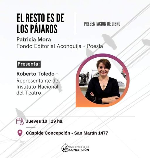Letras de Fuego / Noticias / Presentación de libro. Este jueves 10 de agosto, a las 19, la escritora Patricia Mora presentará su libro “El resto es de los pájaros”, seleccionado y publicado por el Fondo Editorial Aconquija.