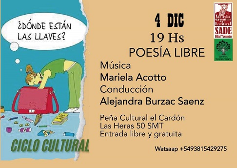 Letras de Fuego / Noticias. “¿Dónde están las llaves?”, el tradicional ciclo de la Sociedad Argentina de Escritores (SADE) Filial Tucumán, tendrá su próxima presentación este miércoles 4 de diciembre, en la Peña Cultural El Cardón.