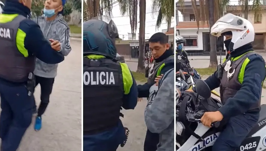 “Pedile que te devuelva el teléfono que te ha sacado de tu bolsillo, pedile, bro”. Las imágenes suceden a la luz del día, en plena calle y cuando intervino la Policía motorizada de Lules: efectivos detuvieron la marcha de un motociclista, quien aparentemente circulaba sin casco y, de hecho, acepta que se le quite el vehículo.