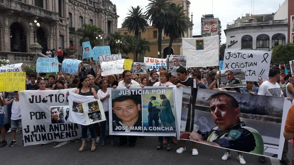 Familiares, amigos y compañeros de los efectivos asesinados en el parque 9 de Julio llegaron a las inmediaciones de Casa de Gobierno con pancartas y fotos para reclamar que se avance en la investigación.