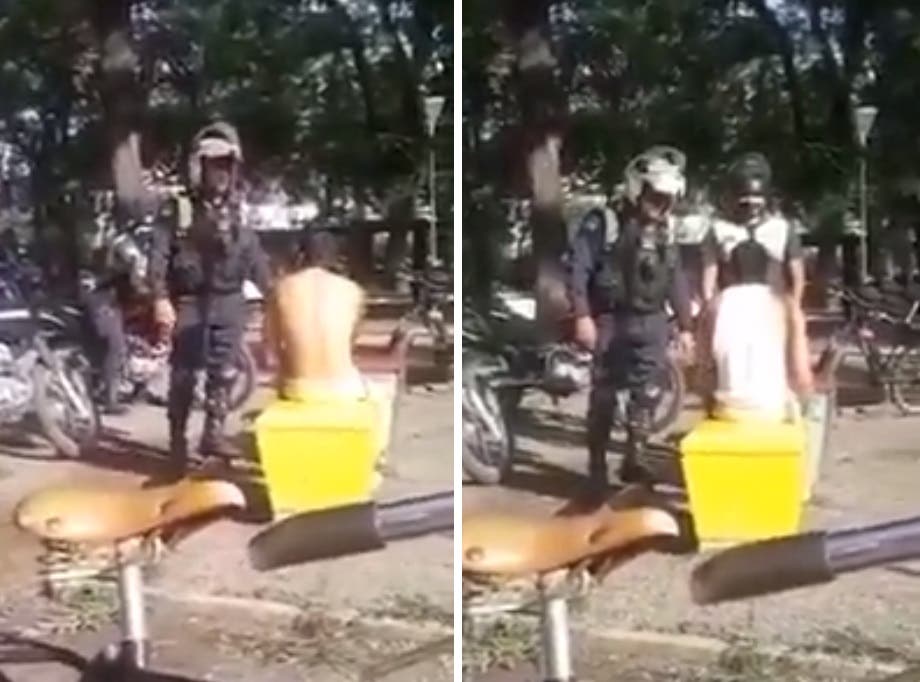 En las imágenes se observa a al menos tres policías que lo rodean y lo obligan a ponerse la remera. Desde la mesa de un bar, otras personas filmaron el procedimiento.