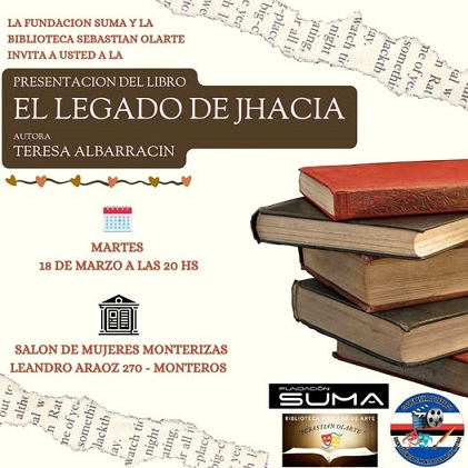 Letras de Fuego / Noticias. Un momento esperado se vivirá este martes 18 de marzo, a las 20, en Monteros, cuando la Fundación SUMA y la Biblioteca Popular de Arte “Sebastián Olarte” presenten el libro “El legado de Jhacia”, de la autora Teresa Albarracín.