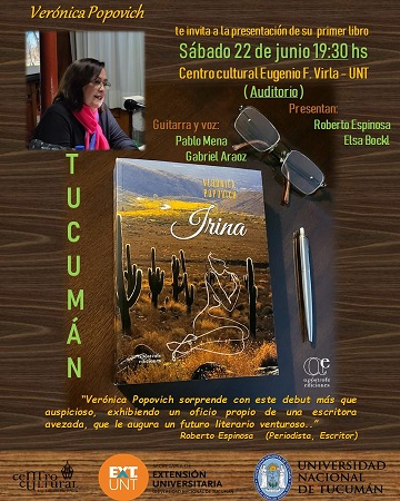 Letras de Fuego / Noticias. Este sábado 22 de junio, desde las 19.30, en el Centro Cultural Eugenio Flavio Virla, de la UNT, se presentará el libro “Irina” de la escritora Verónica Popovich.