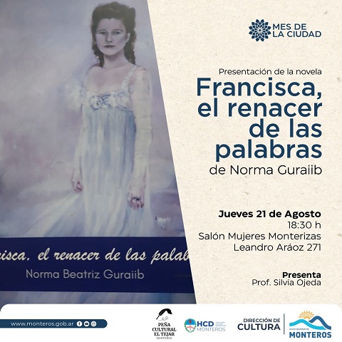 Este jueves 21 de agosto, a las 18.30, en el Salón Mujeres Monterizas, ubicado en Leandro Aráoz 271, se presentará la novela “Francisca, el renacer de las palabras”, de la escritora tucumana Norma Guraiib.