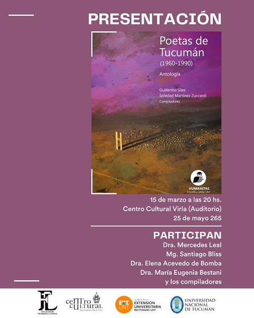 La presentación de la antología “Poetas de Tucumán (1960-1990)”, compilada por Guillermo Siles y Soledad Martínez Zuccardi, tendrá lugar el 15 de marzo próximo, a las 20, en el Centro Cultural Virla de la Universidad Nacional de Tucumán (UNT).