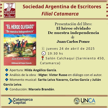 El libro “El héroe olvidado de nuestra Independencia”, de Juan Carlos Ponce será presentado este jueves 24 de abril, a las 19.30, en el Salón Calchaquí, ubicado en Sarmiento 450 de la capital catamarqueña.