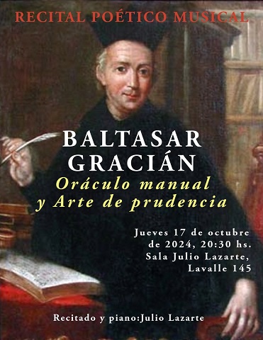 - Jueves 17 de octubre, a las 20.30, “Oráculo manual y Arte de prudencia”, de Baltasar Gracián. Recitado y piano: Julio Lazarte.
