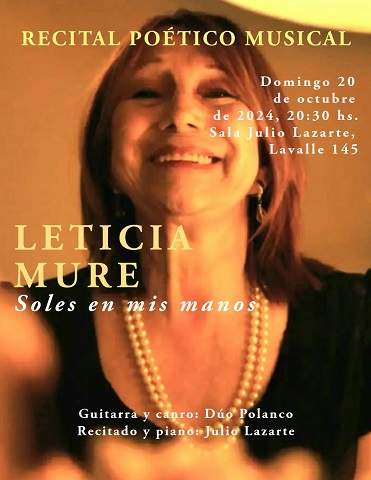- Domingo 20 de octubre, a las 20.30, “Soles en mis manos”, de Leticia Mure. Guitarra y Canto: Dúo Polanco.