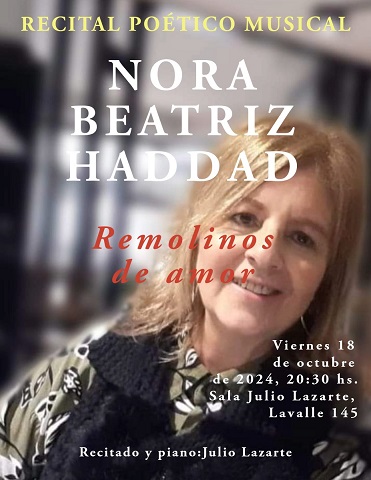 - Viernes 18 de octubre, a las 20.30, “Remolinos de amor”, de Nora Beatriz Haddad. Recitado y piano: Julio Lazarte.