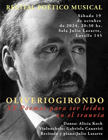 - Sábado 19 de octubre, a las 20.30, “XX Poemas para ser leídos en el tranvía”, de Oliverio Girondo. Danza: Alicia Koch. Violonchelo: Gabriela Canaviri. Recitado y piano: Julio Lazarte.