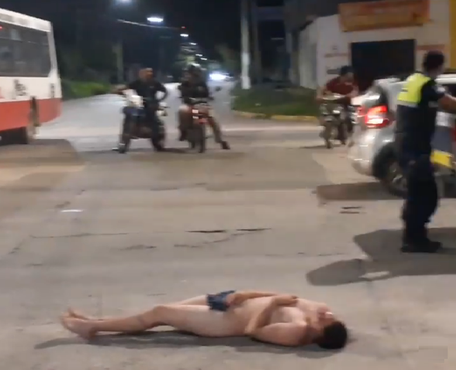 Ahí se puede ver al ladrón acostado en el pavimento, cubriendo a duras penas sus partes íntimas tras haber sido totalmente despojado de sus ropas.